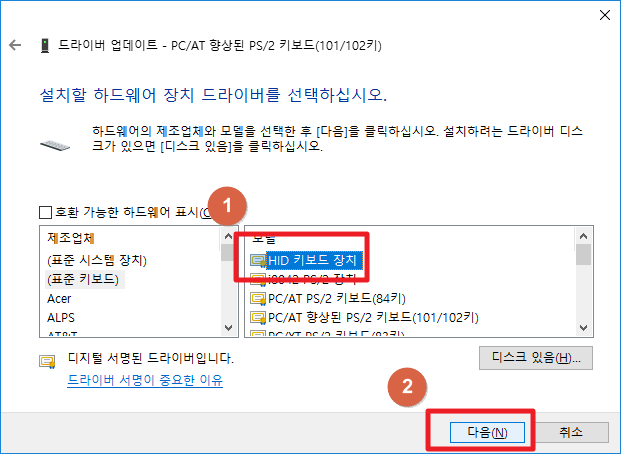 표준 키보드 -> HID 키보드 장치를 선택해 주시고