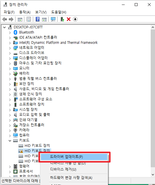 우클릭 해서 드라이버 업데이트를 해주세요.