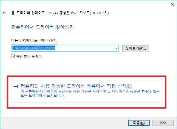"컴퓨터가 사용 가능한 드라이버 목록에서 직접 선택"을 눌러줍니다.