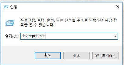 devmgmt.msc 를 이용해 장치 관리자를 켜줍시다.