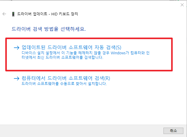 "업데이트된 드라이버 소프트웨어 자동 검색"을 선택해주고 잠시 기다려주세요.