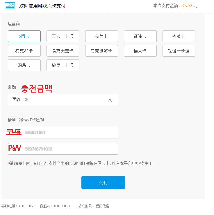 QQ 카드(Q币卡) 외에도 천홍카드(天宏一卡通) 등의 기프트카드 또한 결제가 가능하니 참고합시다. 저는 그냥 QQ카드로 했습니다.