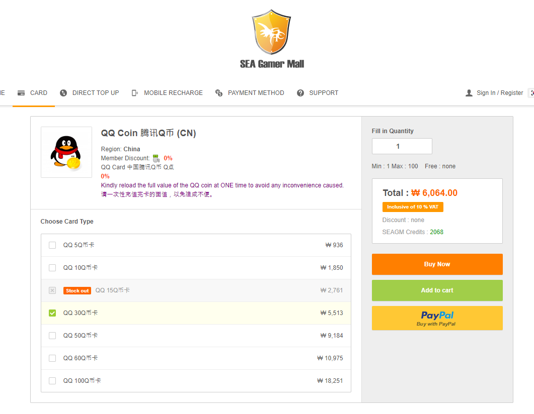 먼저, QQ카드는 SEA Gamer Mall 이나 OffGamers 에서 구매할 수 있습니다.