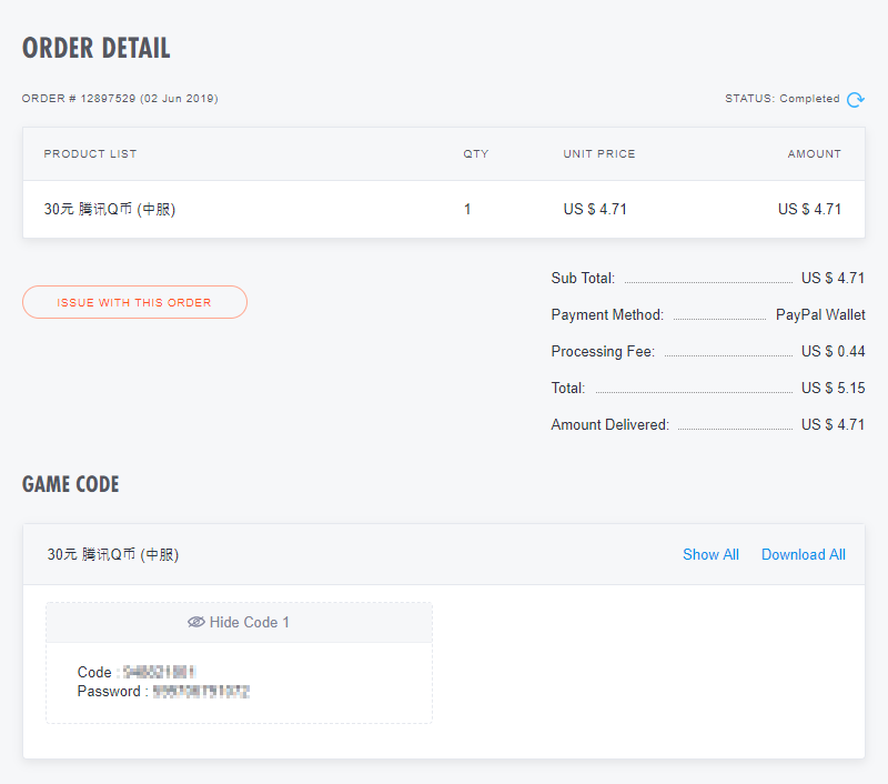 위처럼 GAME CODE 부분에 QQ 코인의 CODE 와 Password가 나타났습니다. 이를 저장해둡시다.
