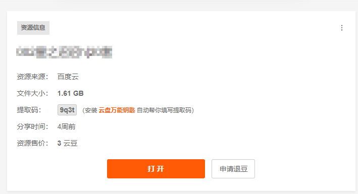 자료를 사게 되면 위처럼 오픈 옆에 반품신청(申请退豆) 란이 추가되며, 오픈을 누르면 바이두 공유링크가 열리게 됩니다. 이후 본인의 클라우드로 옮기거나 다운로드 받으시면 됩니다.(개인적으로는 우선 개인의 클라우드로 옮기는걸 추천드립니다. 언제 삭제될지 모르니까요)