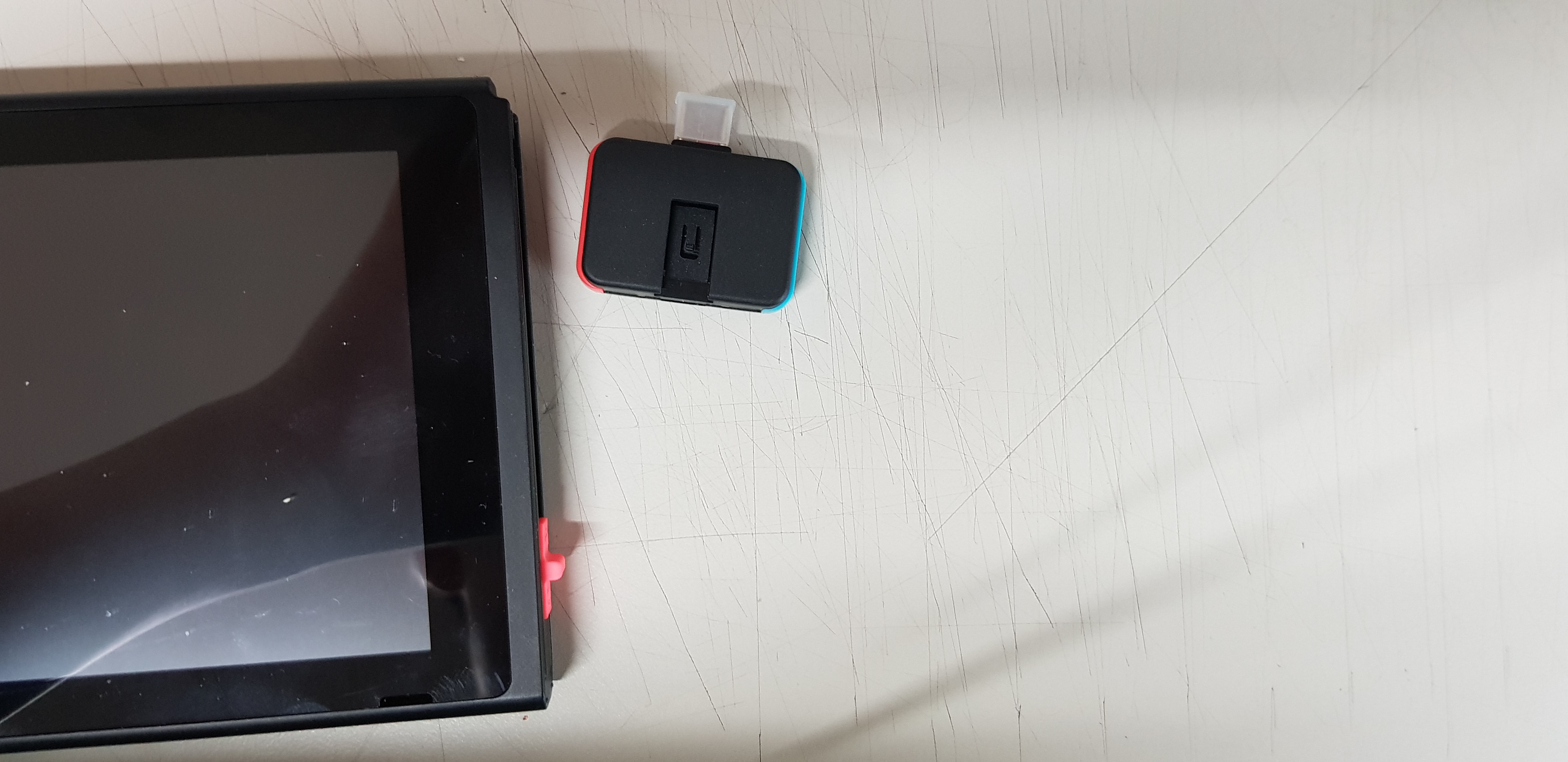 이제 Payload에 진입을 해서 SX OS를 부팅해야 합니다. RCM Loader의 뒷면에 있는 플라스틱 쪼가리(Jig, 지그라고 합니다)를 꺼내 우측의 조이콘을 빼고 위 사진처럼 지그를 끝까지 밀어넣습니다.