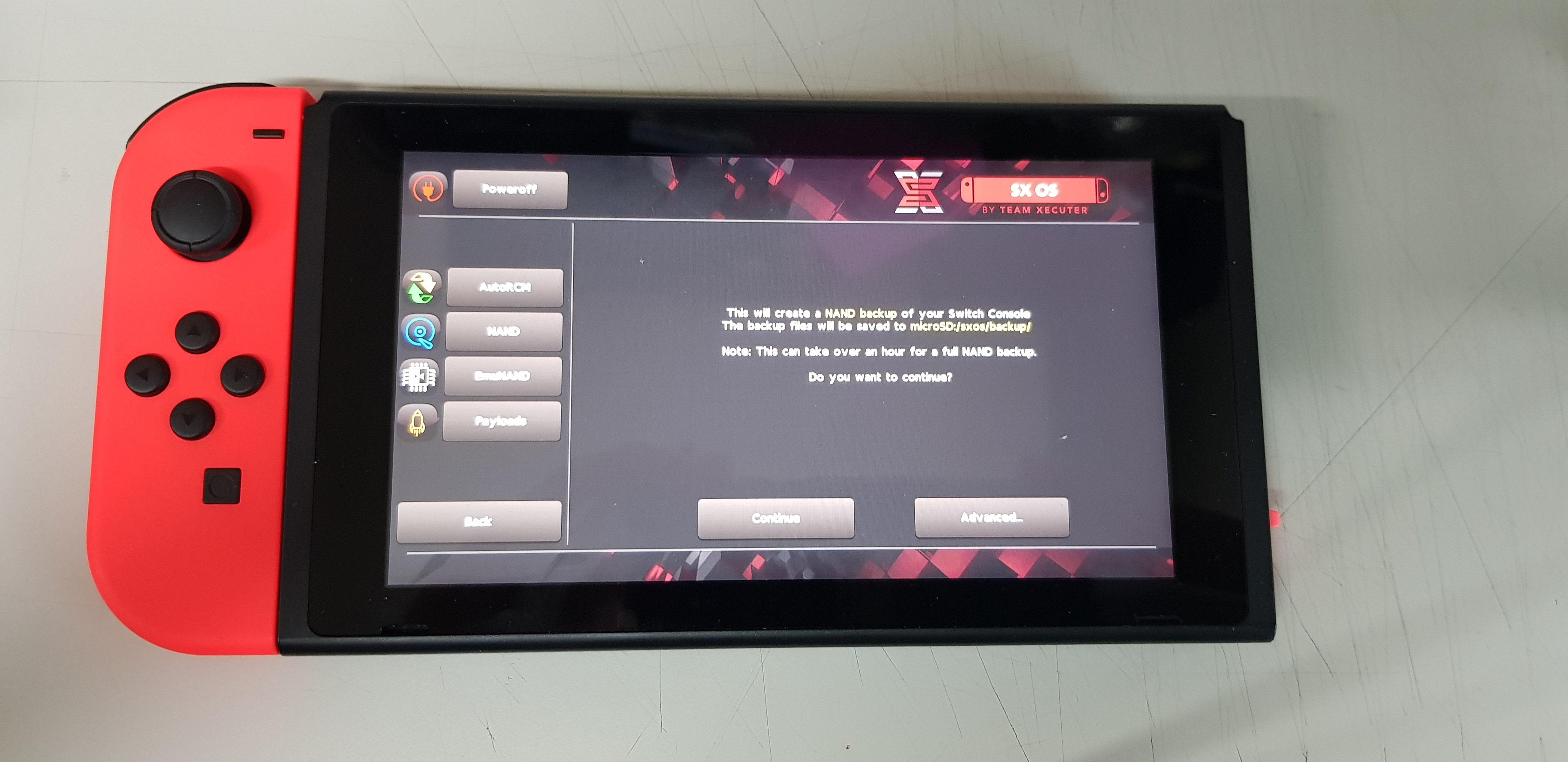 정상적으로 부팅이 되면 페이로드가 주입되면서 위와 같이 SX OS로 접근하게 됩니다. 마음만 같아선 Boot custom FW를 하고 싶지만, 우선 저희는 안전을 위해 백업과 EmuNand를 생성할겁니다.