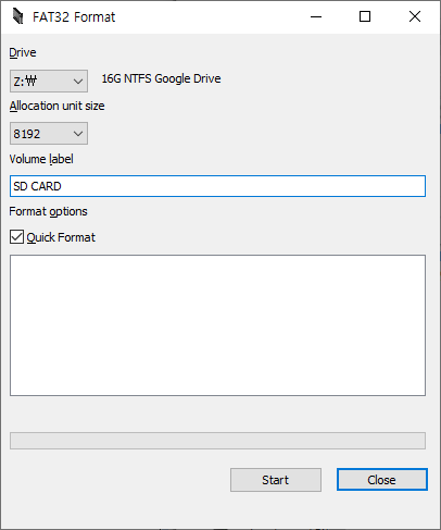 위 프로그램을 다운받고 실행하면 위 사진과 같은 창이 뜨는데, SD카드의 드라이브를 선택 후 Start를 눌러 Fat32 방식으로 포맷 시켜주시면 됩니다.