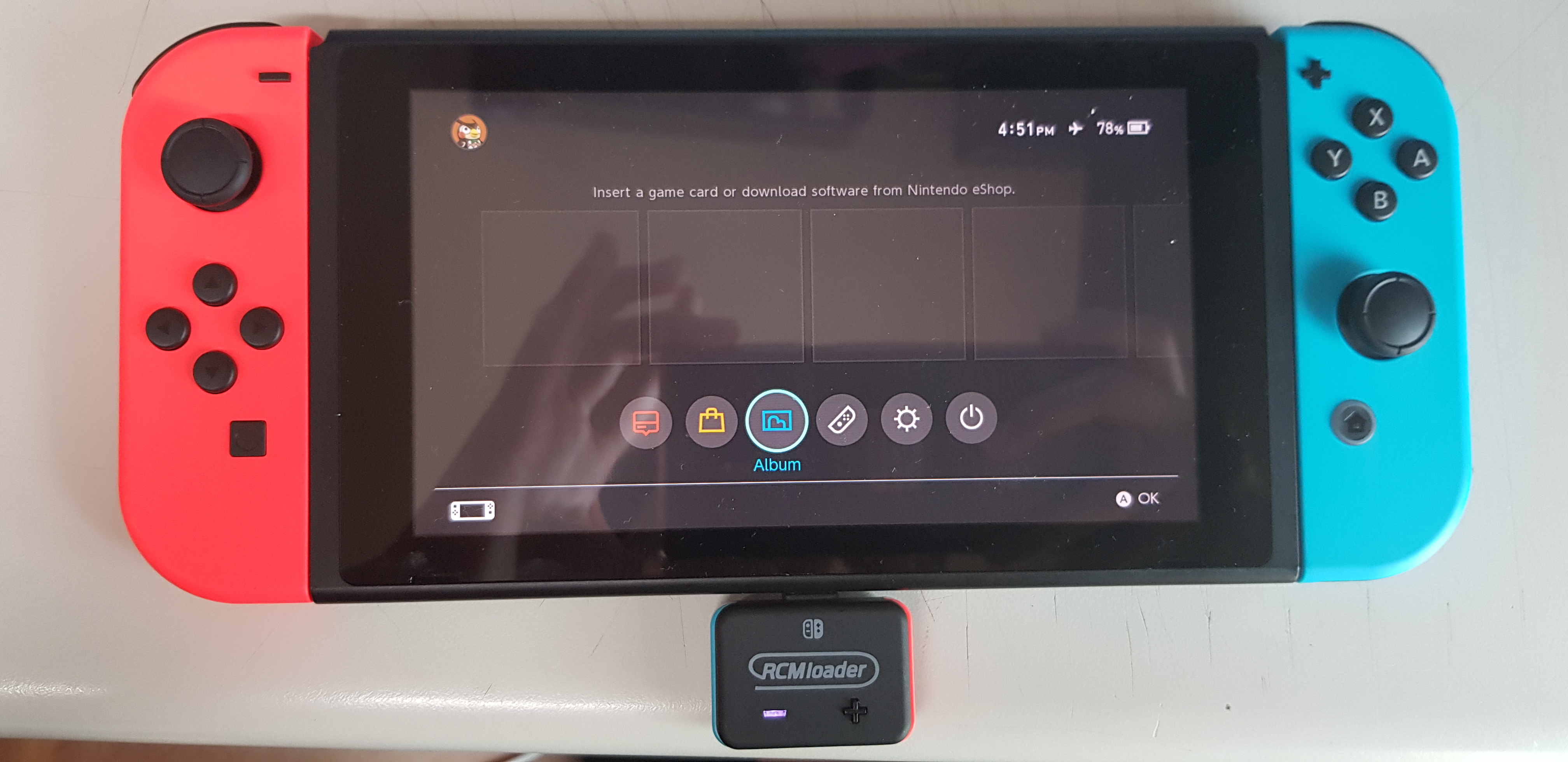 이제 위와같이 정상적인 것 처럼(마치 원래 닌텐도 스위치가 켜지는 것 처럼) 켜지는데, 이는 시스템 낸드를 복사해서 그런것이고, 저렇게 보여도 에뮤낸드로 정상적으로 들어온 것이니 무시하셔도 됩니다. 커펌이 된것을 확인하기 위해 Album(앨범)을 아무 버튼도 누르지 않은 상태로 들어가 봅시다.