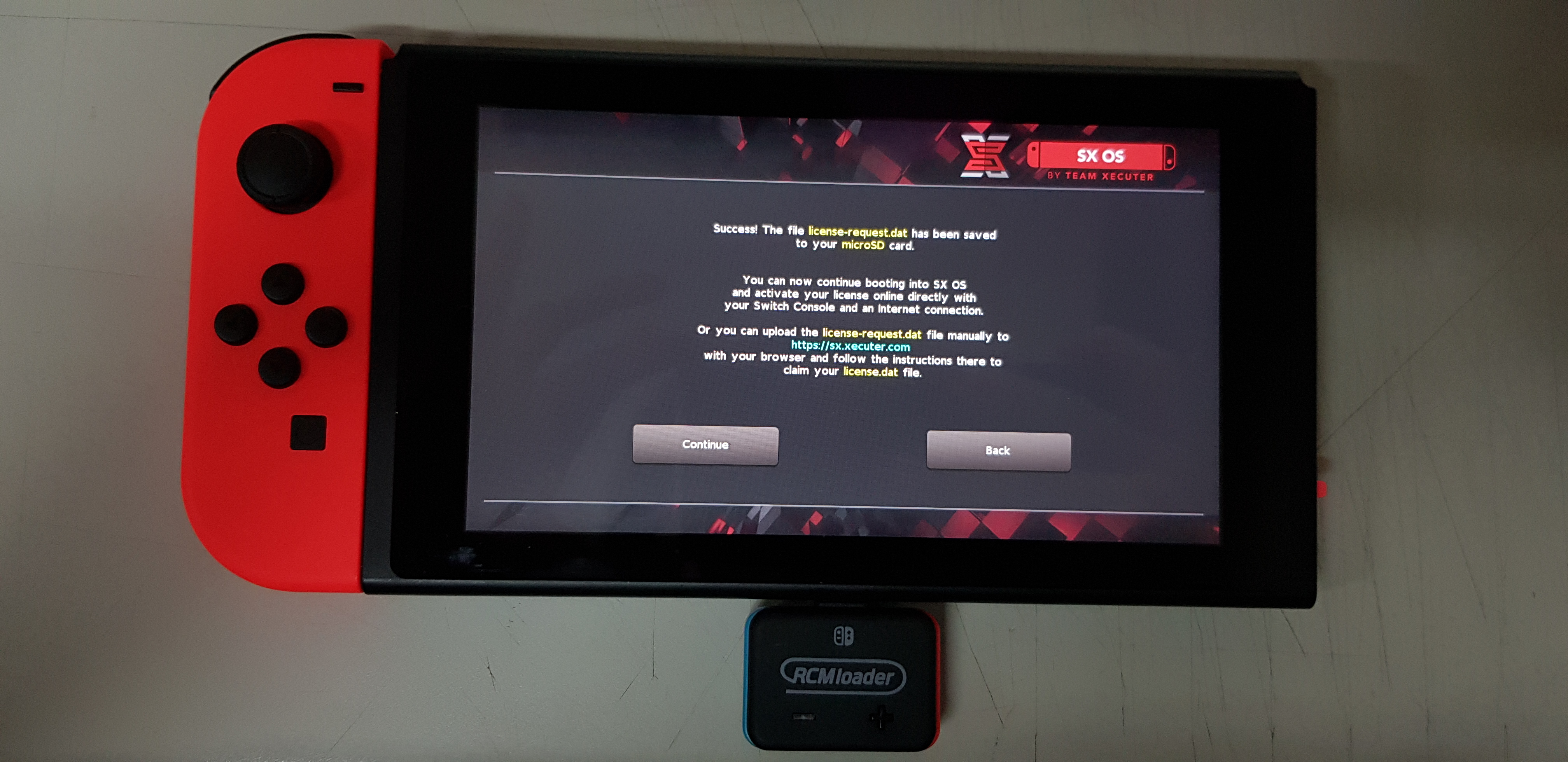 그럼 위처럼 license-request.dat 가 SD카드에 생성됬다는 말이 나옵니다. 이제 이 파일을 이용해서 이 스위치를 인증해야 되는 셈이죠. Continue를 누르고 스위치를 종료한 다음, SD카드를 PC에 연결해줍니다.