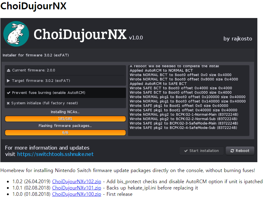 좌측의 옵션을 보시면, Prevent fuse burning (enable AutoRCM) 이라는 것이 있는데, 이건 업데이트 시 특정 퓨즈를 태워버리는 일종의 다운그레이드 방지책을 막은 채로 업데이트 하는 방식입니다. 저는 짤에서는 체크한 채로 설치했지만, 현재는 AutoRCM의 단점 때문에 그냥 퓨즈를 태워버린 채로, 즉 체크를 해제한 채로 사용하곤 하는데 이건 개인의 선택입니다.