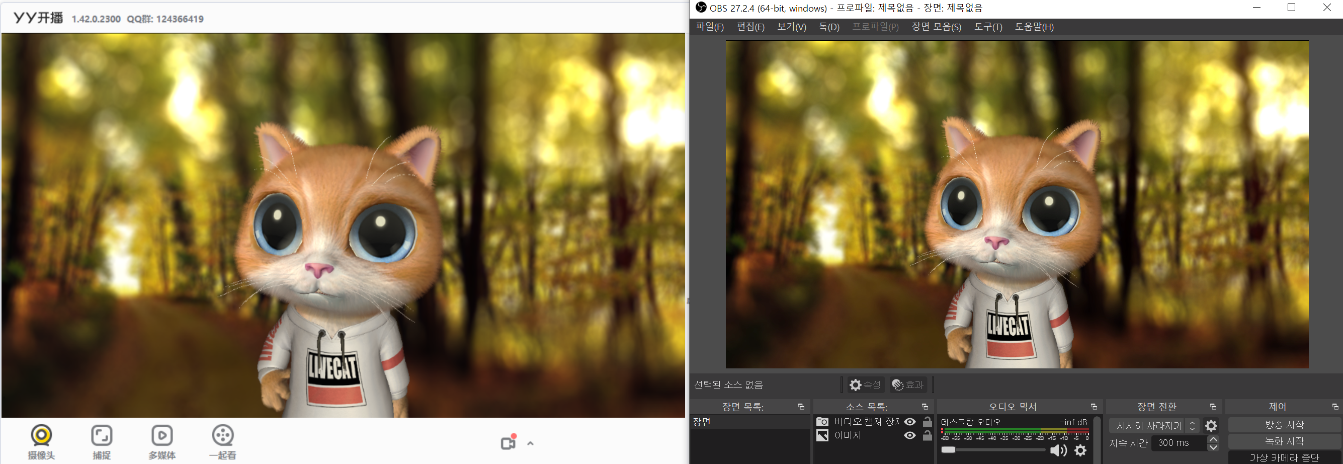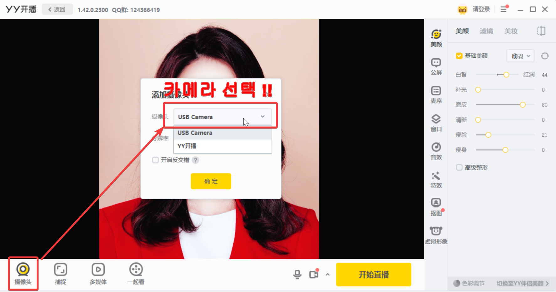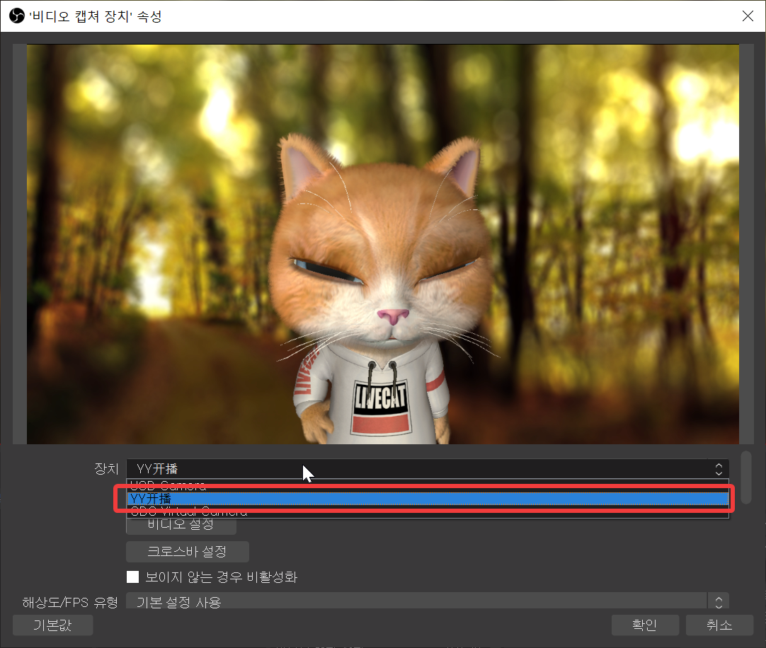 그 다음 "비디오 캡쳐 장치" 속성에 들어가보면 위와 같이 YY开播 (YY개파) 항목이 있습니다. 이걸 선택하면 YY开播의 방송을 그대로 OBS로 가져올 수 있습니다.