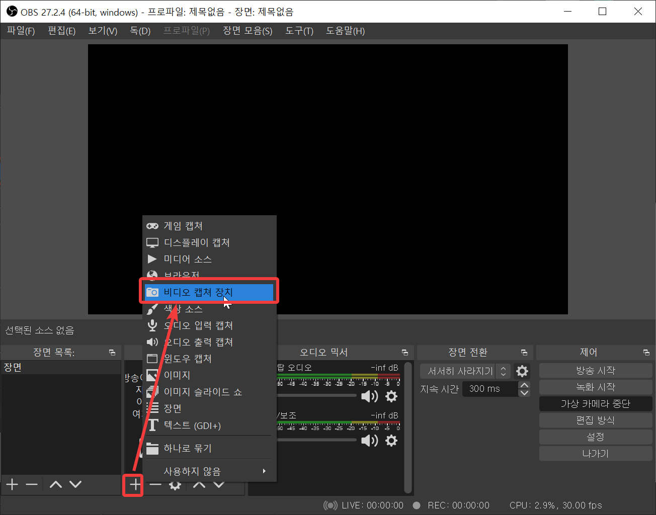위와 같이 설정을 한 뒤에, 그대로 OBS로 간 상태에서 비디오 캡쳐 장치로 추가할 수 있습니다. OBS에 들어간 다음 "+" 버튼을 누르고, "비디어 캡쳐 장치"를 선택합니다.