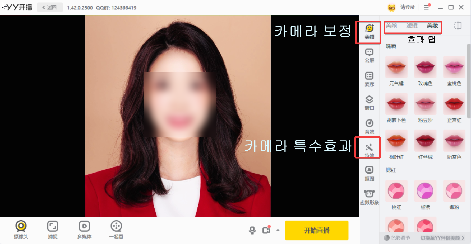 카메라 보정은 말 그대로 색감이나 흔히 말하는 중국의 공간왜곡 효과 등을 넣을수 있고, 특수효과는 도파님이나 요플래님이 주로 쓰는 선글라스, 유미, 디바 등등의 기능을 쓸 수 있습니다.