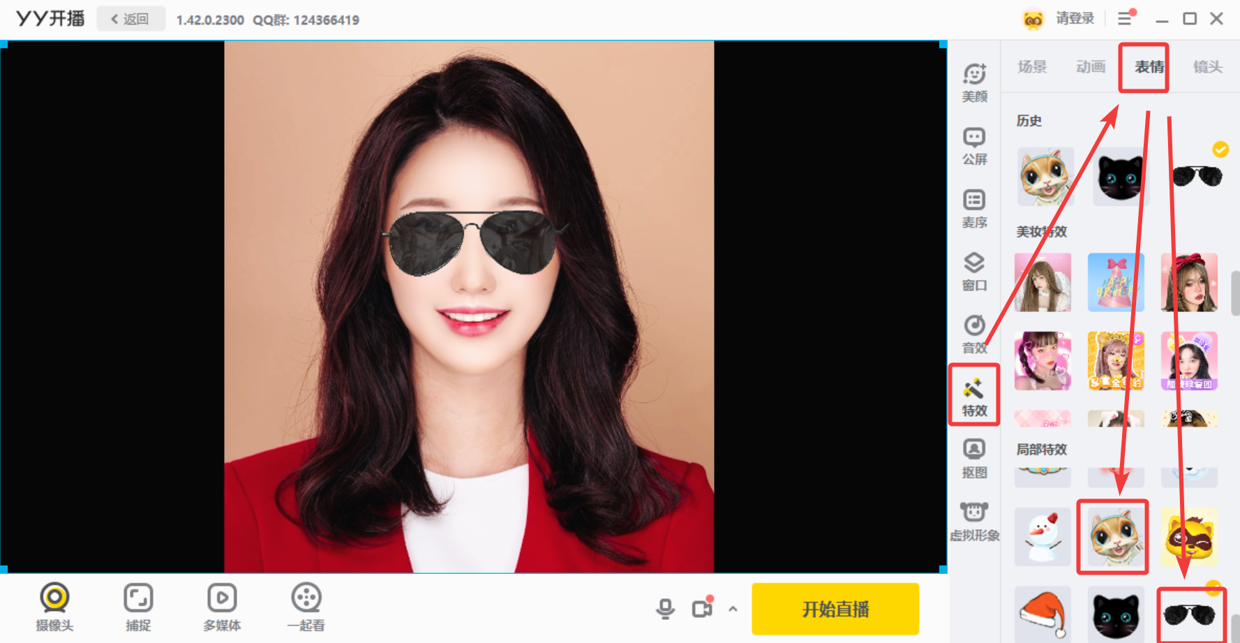 예를 들어, 이렇게 도파님의 선글라스 효과를 쓰고 싶다면 특수효과 탭에 가서 表情(표정) 탭 -> 하단에 내려보면 선글라스 효과가 있습니다.