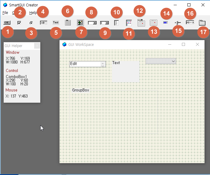 저희가 애용하게될 SmartGUI Creator의 창입니다.